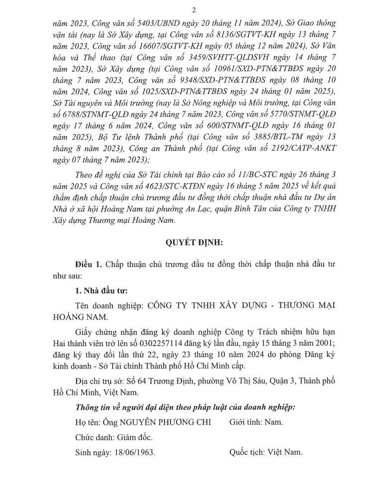Văn bản chấp thuận đầu tư Nhà ở xã hội Hoàng Nam, Lê Cơ – Phường An Lạc, Tp. Hồ Chí Minh